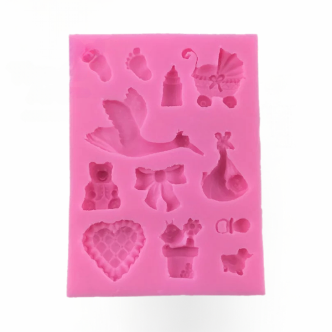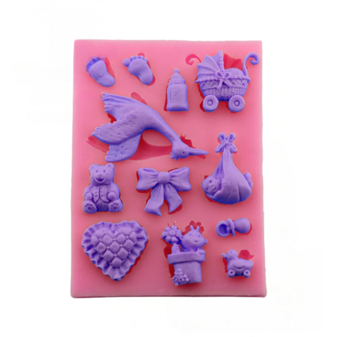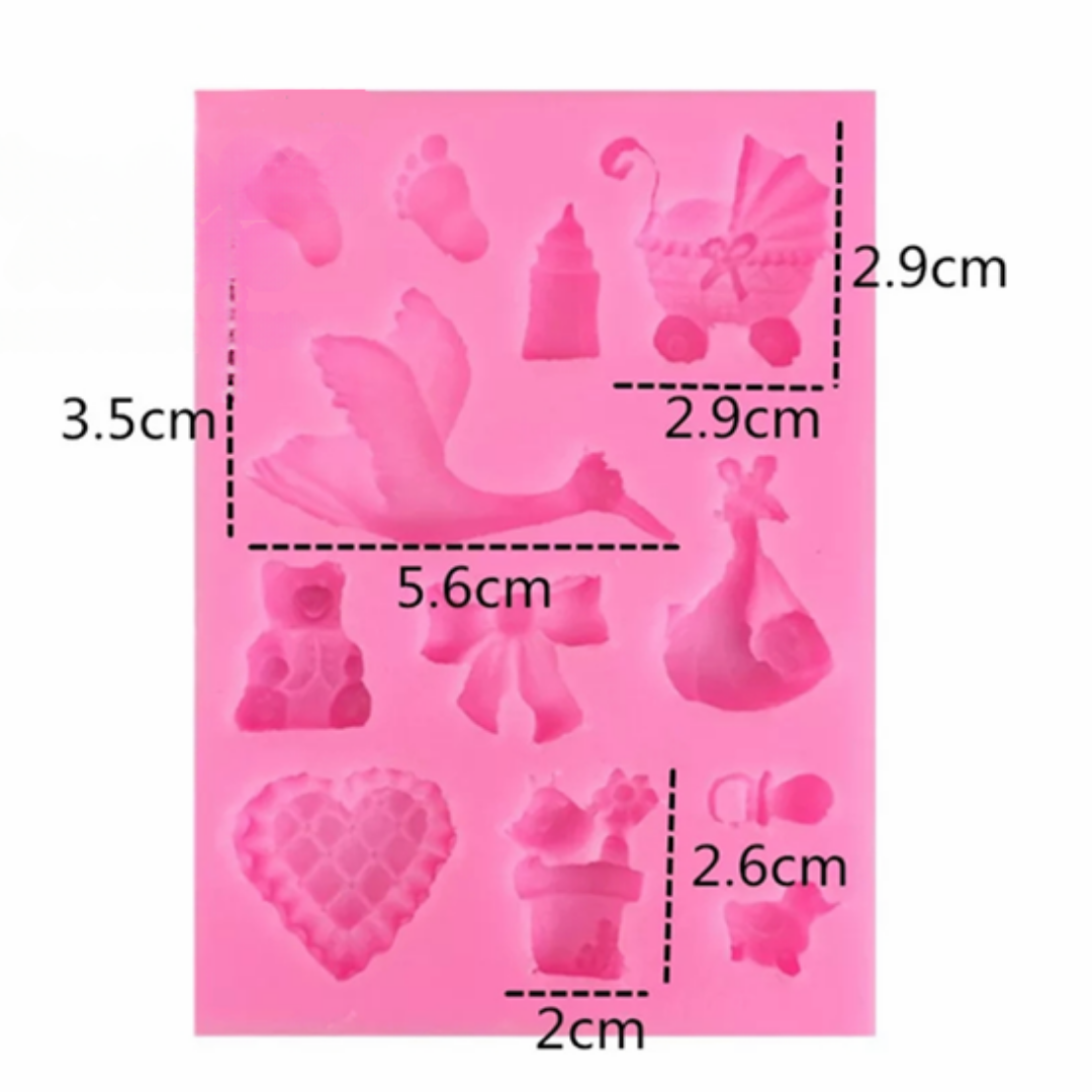Este molde temático para baby shower incluye adorables diseños como cigüeñas, huellitas, biberones, carritos y ositos. Ideal para decorar pasteles, cupcakes y galletas con estilo y ternura en eventos especiales.