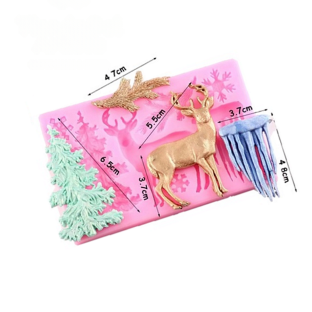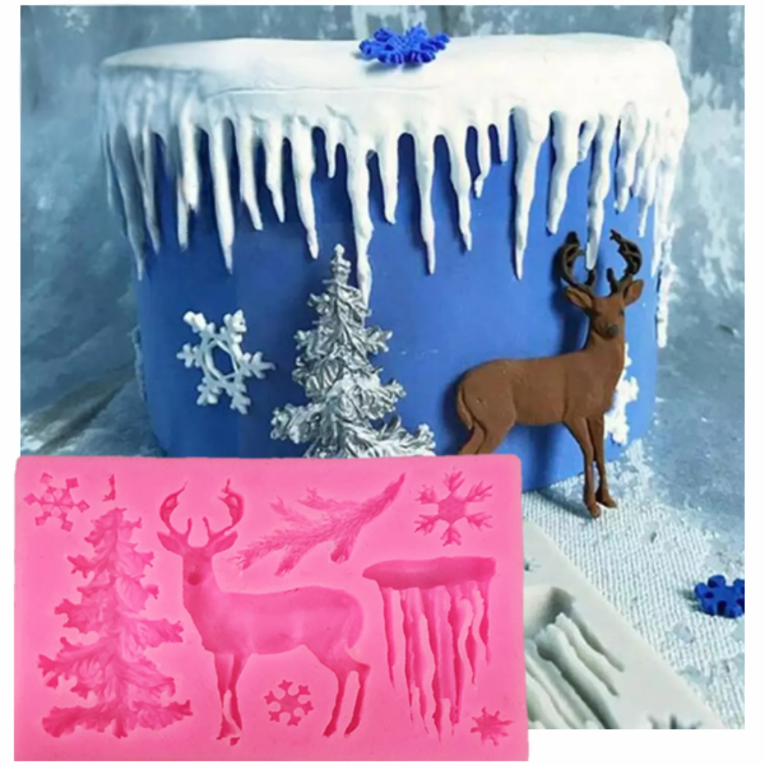 Este molde incluye figuras detalladas de un ciervo, copos de nieve, ramas, pinos y carámbanos. Ideal para decorar pasteles, galletas y cupcakes con un toque mágico y elegante, perfecto para Navidad, bodas invernales o cumpleaños temáticos.