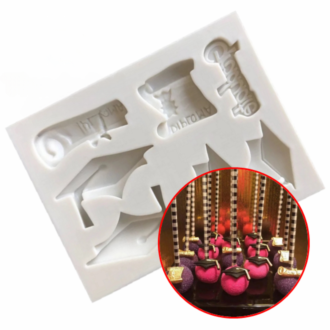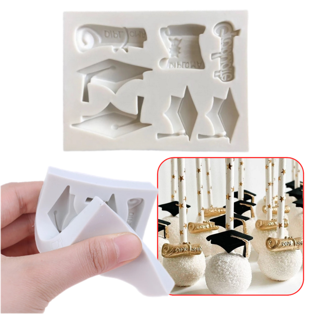 Agrega un toque especial a tus creaciones con este molde temático que incluye birretes, diplomas y sombreros de graduación. Perfecto para decorar cake pops, bombones, galletas y más.