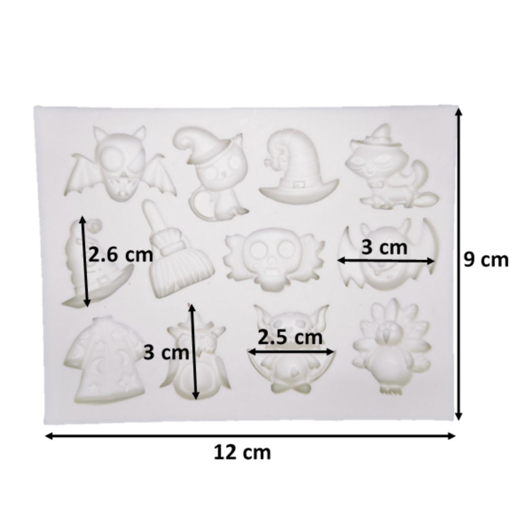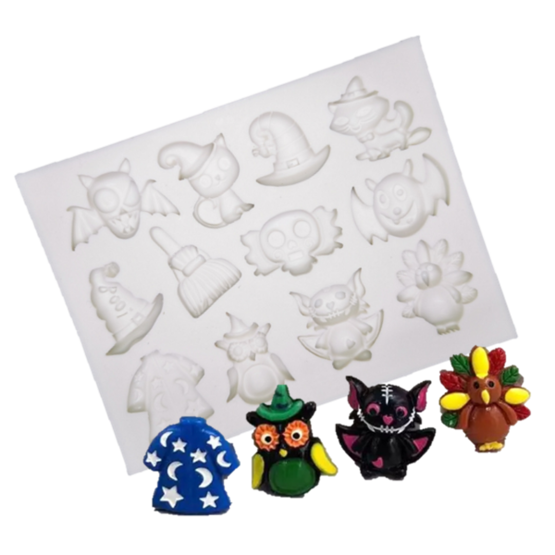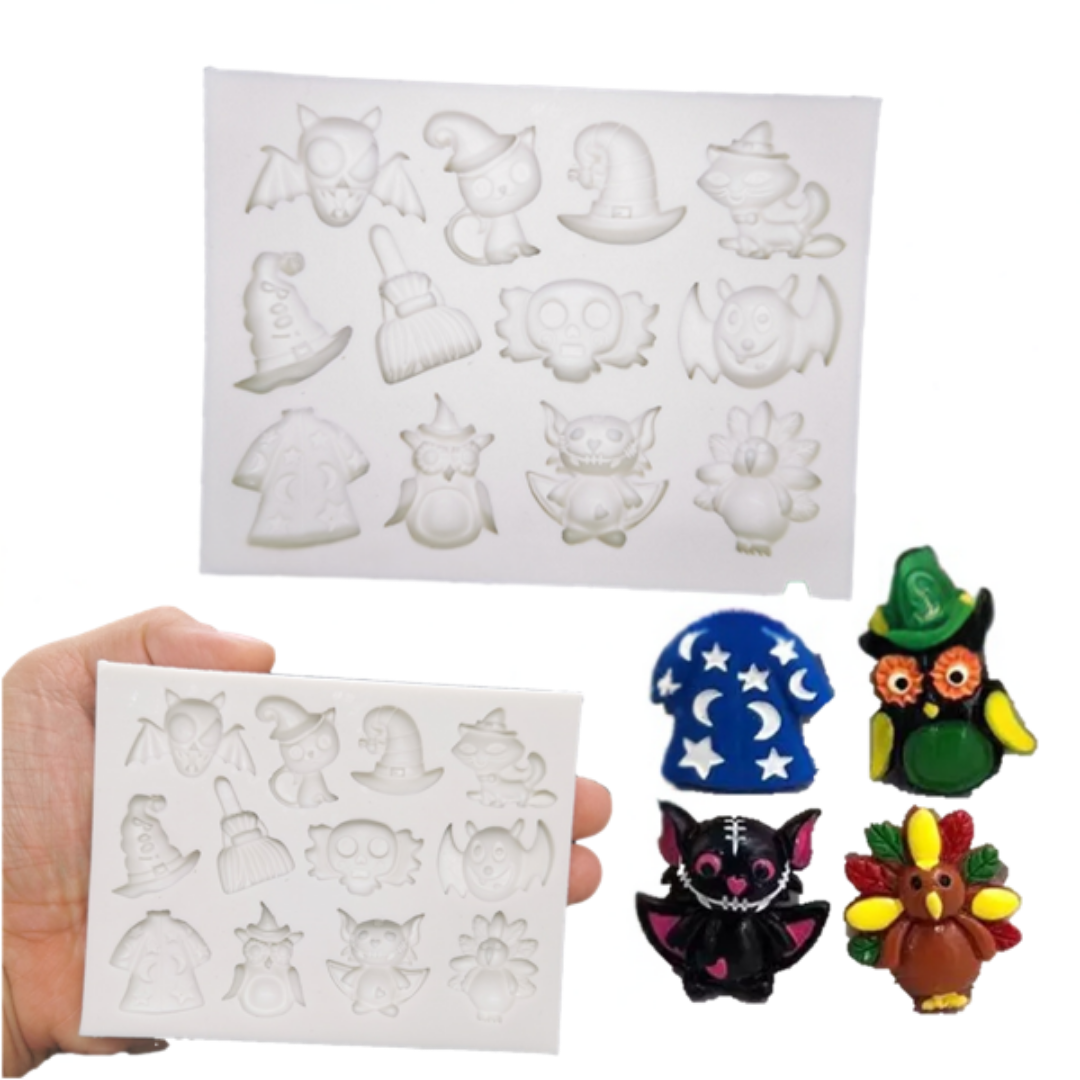 Inspira tu creatividad con este divertido molde de silicona con 15 figuras temáticas de Halloween: murciélagos, brujitas, búhos, calaveras, escobas y más. Perfecto para repostería, manualidades, decoración y mucho más.