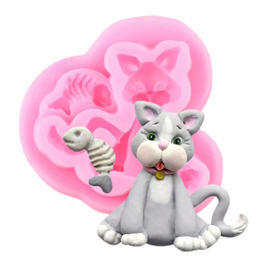 Crea un tierno gatito con expresiones realistas y detalles adorables, ideal para decorar tortas, cupcakes, galletas, figuras de fondant o arcilla polimérica. Incluye también un simpático huesito de pescado como accesorio extra.
