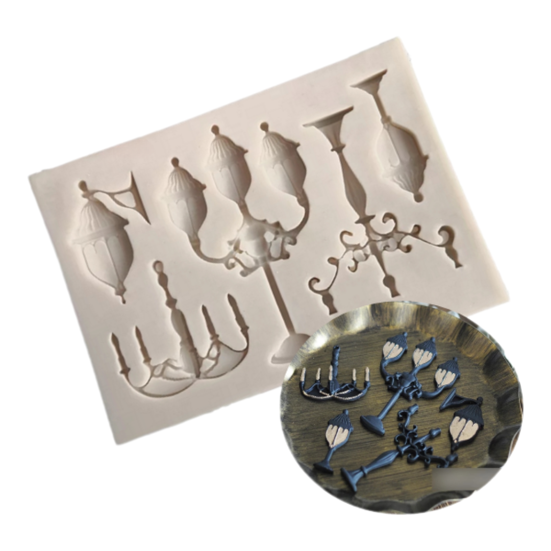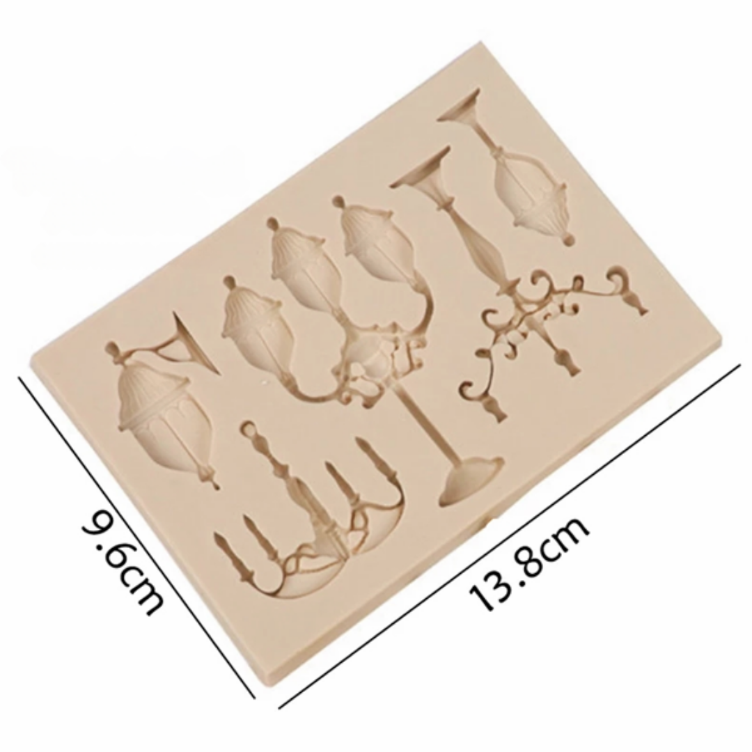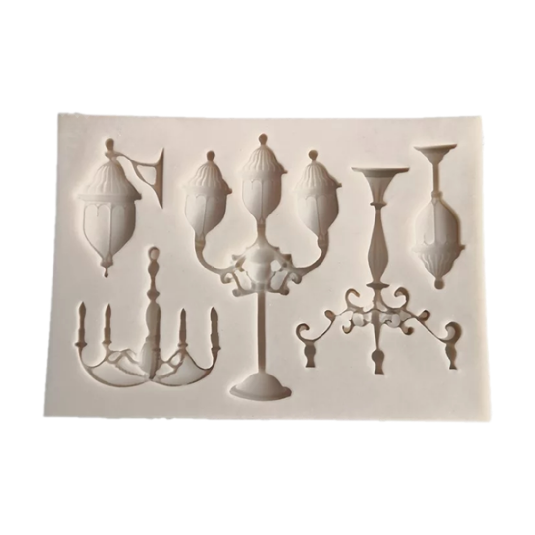 Decora tus creaciones con un toque clásico y sofisticado. Este molde permite replicar detalles como lámparas antiguas y candelabros con gran definición, ideal para tortas temáticas, velas artesanales, resinas, y más.