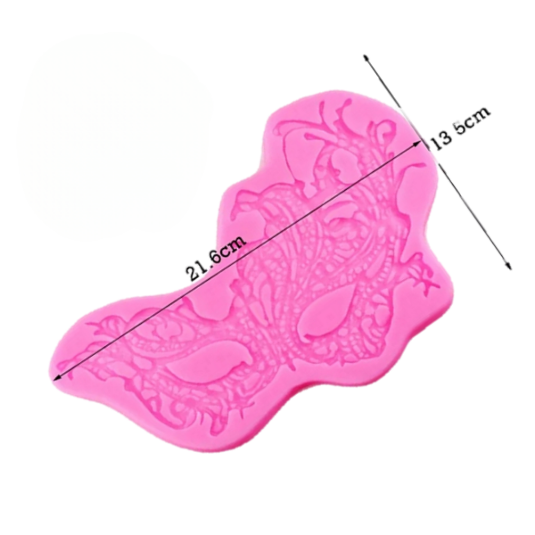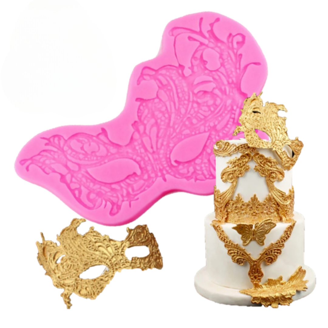 Crea elegantes decoraciones con estilo de carnaval o fiesta de máscaras. Este molde realza cualquier pastel con detalles sofisticados ideales para bodas, aniversarios o eventos temáticos.