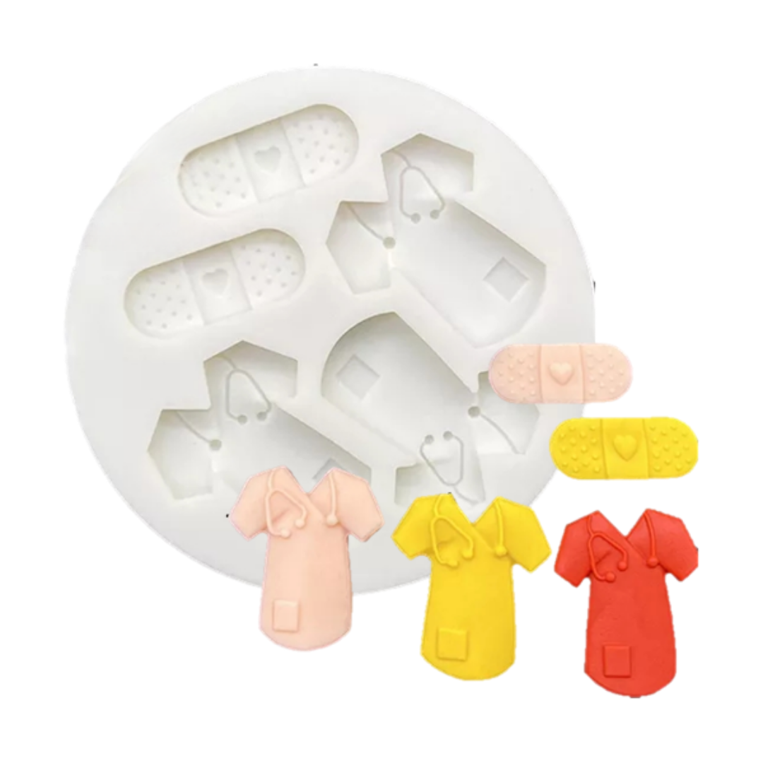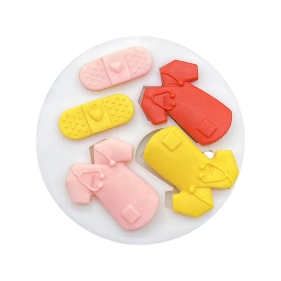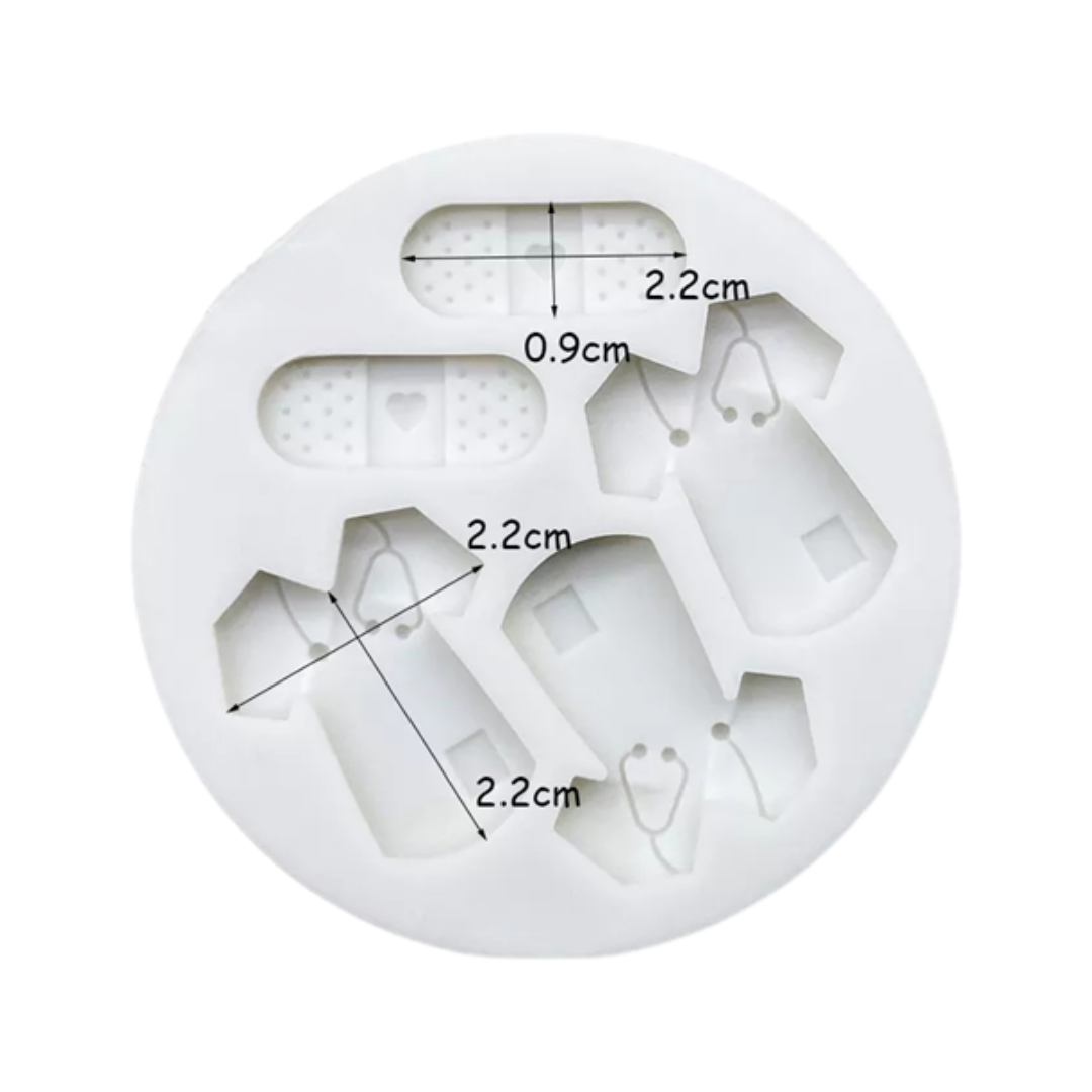 Este molde con diseño de batas médicas y curitas es perfecto para decorar cupcakes, galletas, pasteles, velas o jabones. Ideal para temáticas de salud, celebraciones de personal médico o regalos personalizados con un toque tierno y profesional.