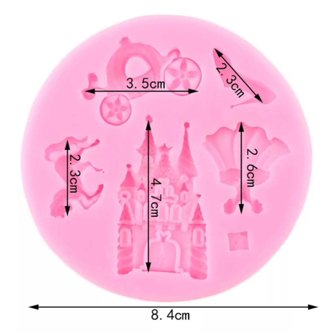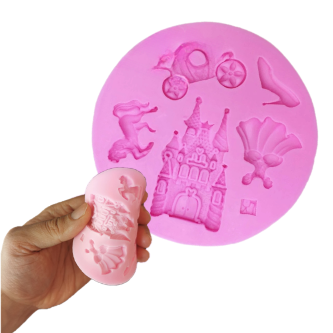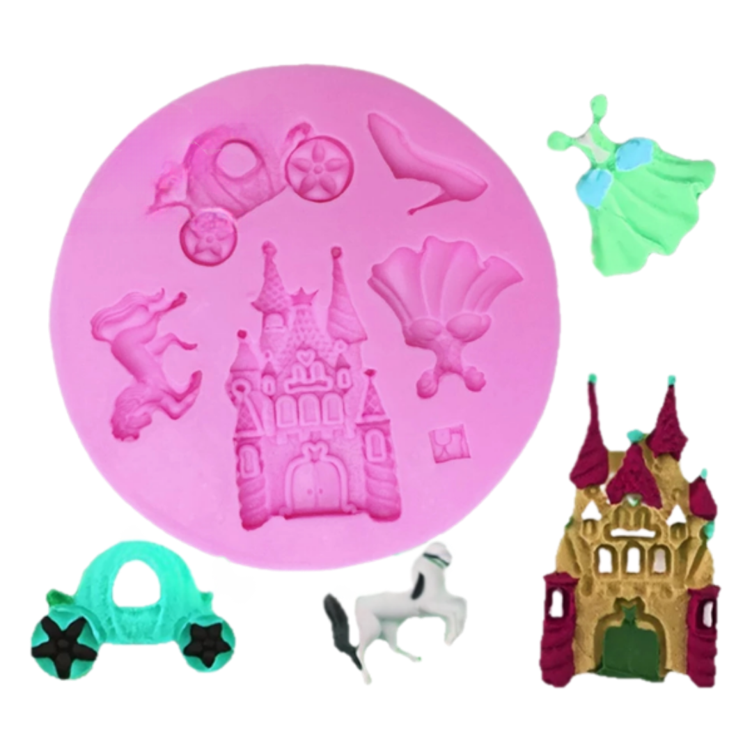 Convierte tus postres en un verdadero cuento de hadas con este hermoso molde de silicona. Diseños encantadores como castillo, carruaje, corona, vestido, caballo y zapatilla, ideales para crear decoraciones dulces y únicas en fiestas temáticas infantiles.