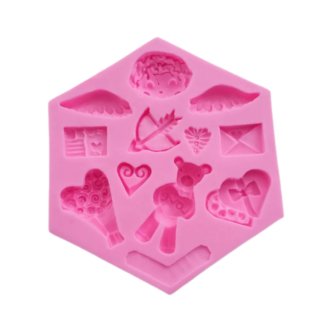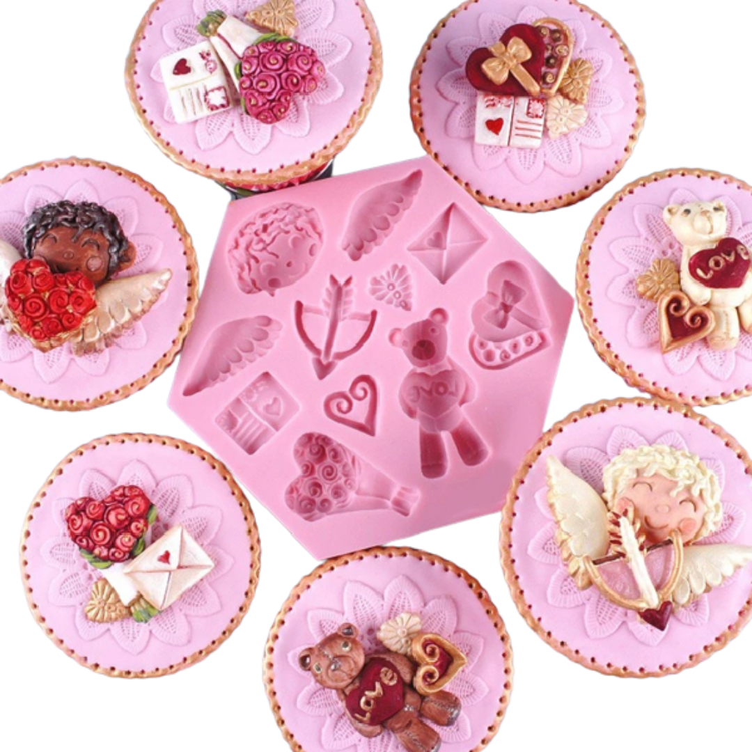 Este molde de silicona es ideal para crear decoraciones encantadoras en fondant, chocolate o pasta de azúcar. Incluye figuras adorables como cupidos, corazones, ositos y flechas para dar un toque único y personalizado a tus postres en fechas especiales como San Valentín, aniversarios o bodas.